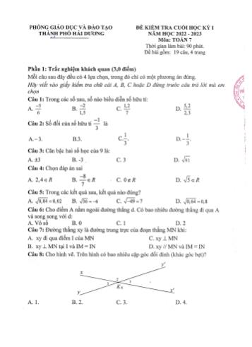 Đề kiểm tra cuối học kì 1 Toán Lớp 7 - Năm học 2022-2023 - Phòng GD&ĐT Hải Dương (Có hướng dẫn chấm)