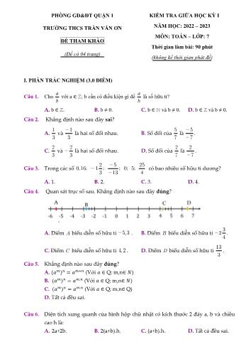 Đề kiểm tra giữa học kỳ I môn Toán Lớp 7 - Năm học 2022-2023 - Trường THCS Trần Văn Ơn (Có đáp án)